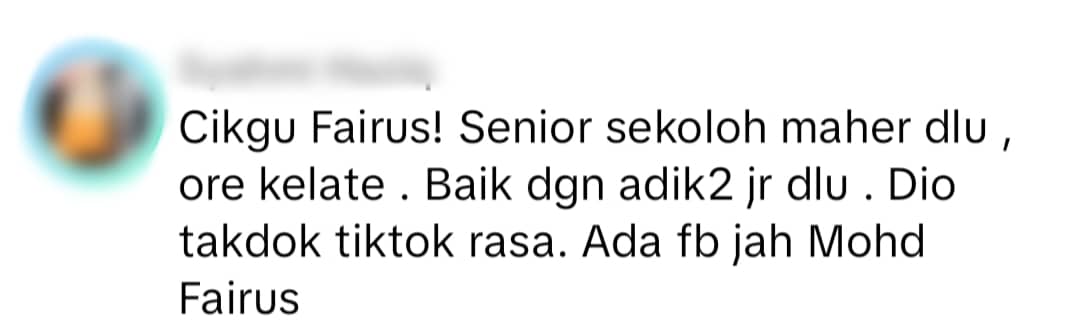 Another commented, "Teacher Fairus is my senior at SMK Dato' Ahmad Maher. He's a Kelantanese. He's very kind to the juniors. I don't think he has a TikTok account but he does have a Facebook account."