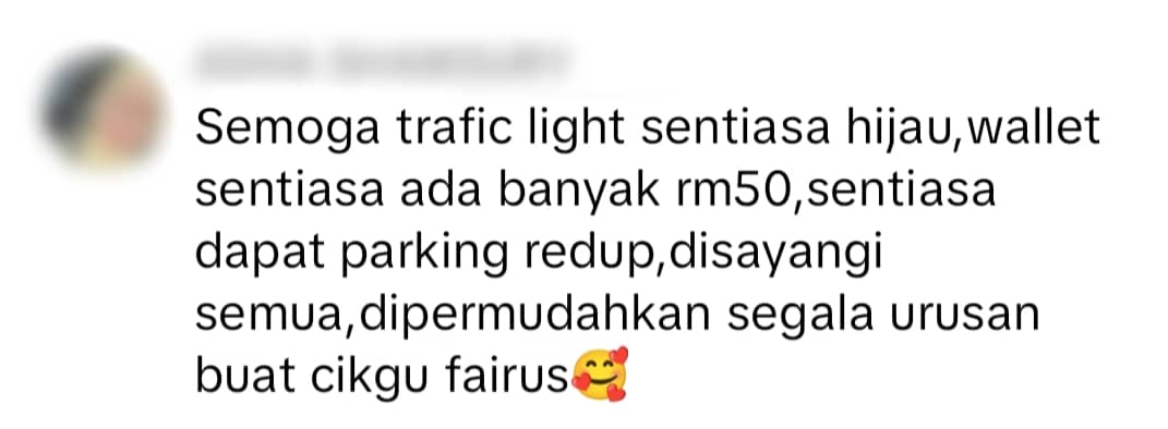 "May the traffic light be always green, his wallet filled with RM50, always got a parking at a shady spot, loved by all and may all his tasks were ease," said a user.