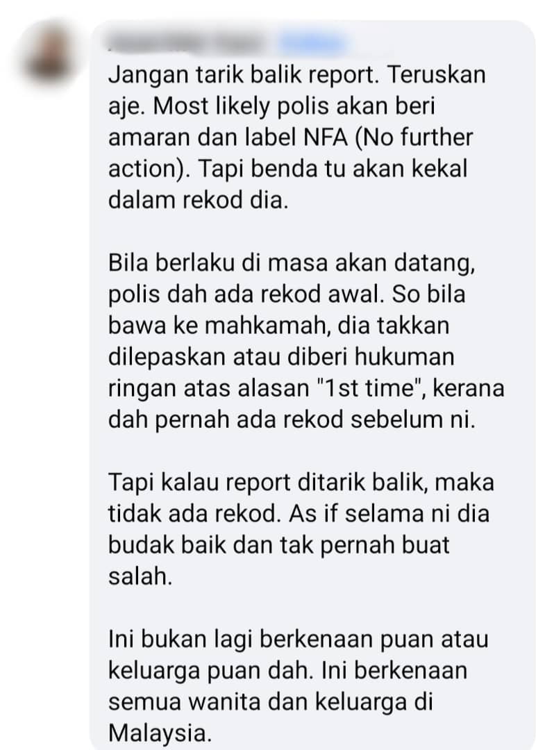 "But if you withdraw the report, it would make his record clean as if he had never done anything wrong. Now, it's not just about you and your family but all women and families in Malaysia,” they added.