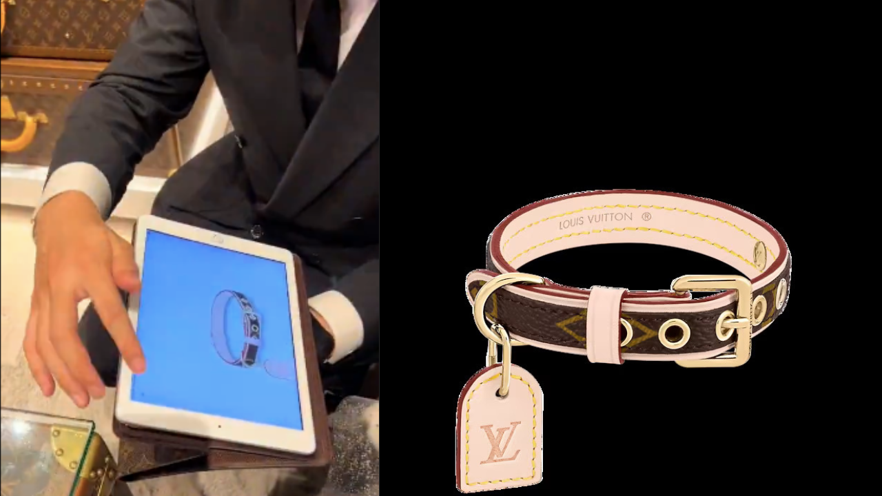 The woman was then shown a leather collar on an iPad, which appears to be this Louis Vuitton Collar XS which goes for RM1,550. It is made of monogram-coated canvas and natural cowhide leather and includes gold-colour hardware. She seemed happy with the collar and promptly put it on the cat. The lady also apparently had bought at least four other LV handbags in various colours, which were placed on the table.