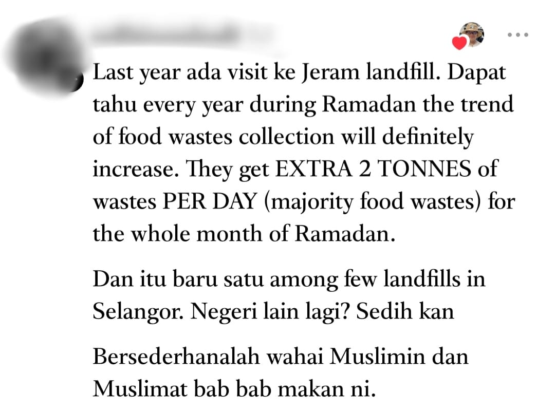 Another user shared, “Last year, I visited the Jeram landfill and found out that during Ramadan, the amount of food waste increases each year. They get an extra two tonnes of waste per day (mostly food waste) for the entire month of Ramadan.