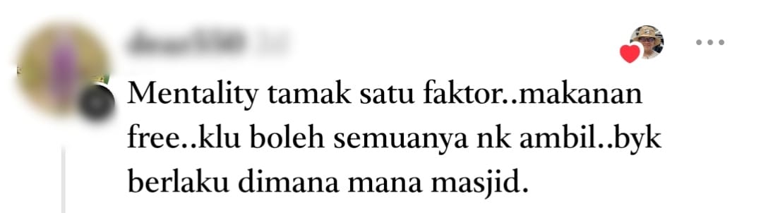 One user pointed out that food wastage during Ramadan is actually among the highest. Another suggested that the mosque committee should follow the practice in Makkah, where worshippers sit and wait for committee members or volunteers to distribute food instead of allowing people to take it themselves.