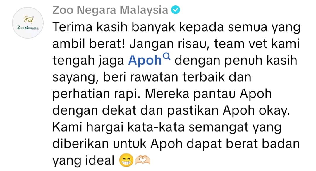 “Thank you so much to everyone for the concern. Don’t worry, our team of vets is taking care of Apoh with love. We’re giving Apoh the best care and are observing him closely. We appreciate the encouraging words to help Apoh reach his ideal weight.”