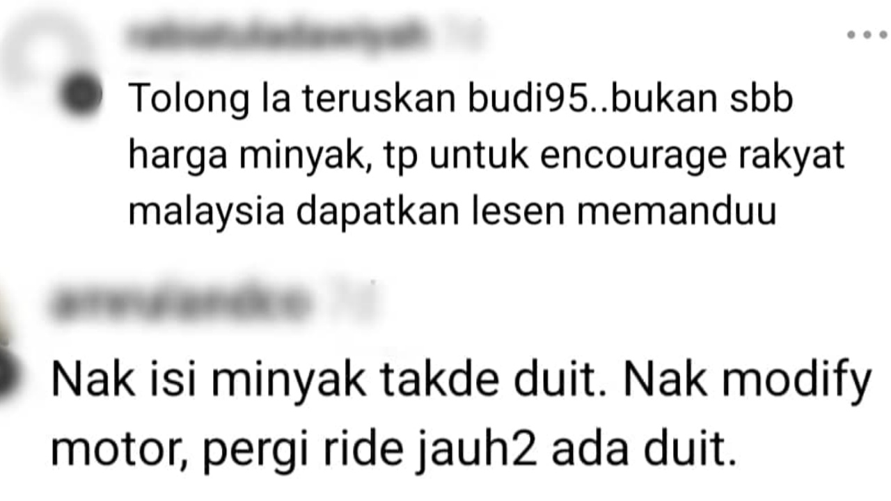 “Please continue the BUDI95. It’s not about the price of fuel, but about encouraging Malaysians to get their driving licence.”