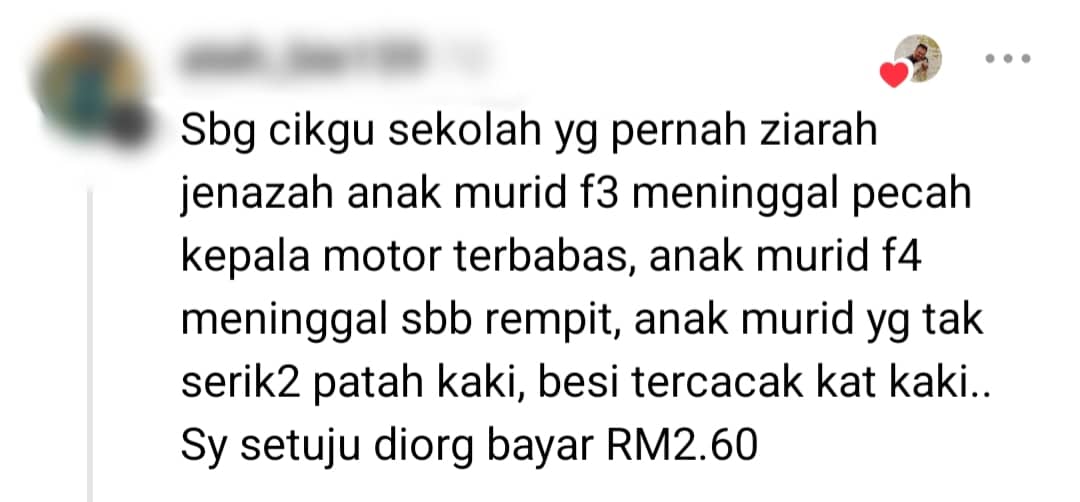 “As a school teacher who visited my late Form 3 student who died from severe head injuries after his motorcycle skidded, and another Form 4 student who died in an illegal race, and others who broke bones in motorbike accidents—I agree that these students should keep paying the full RM2.60 for fuel.”