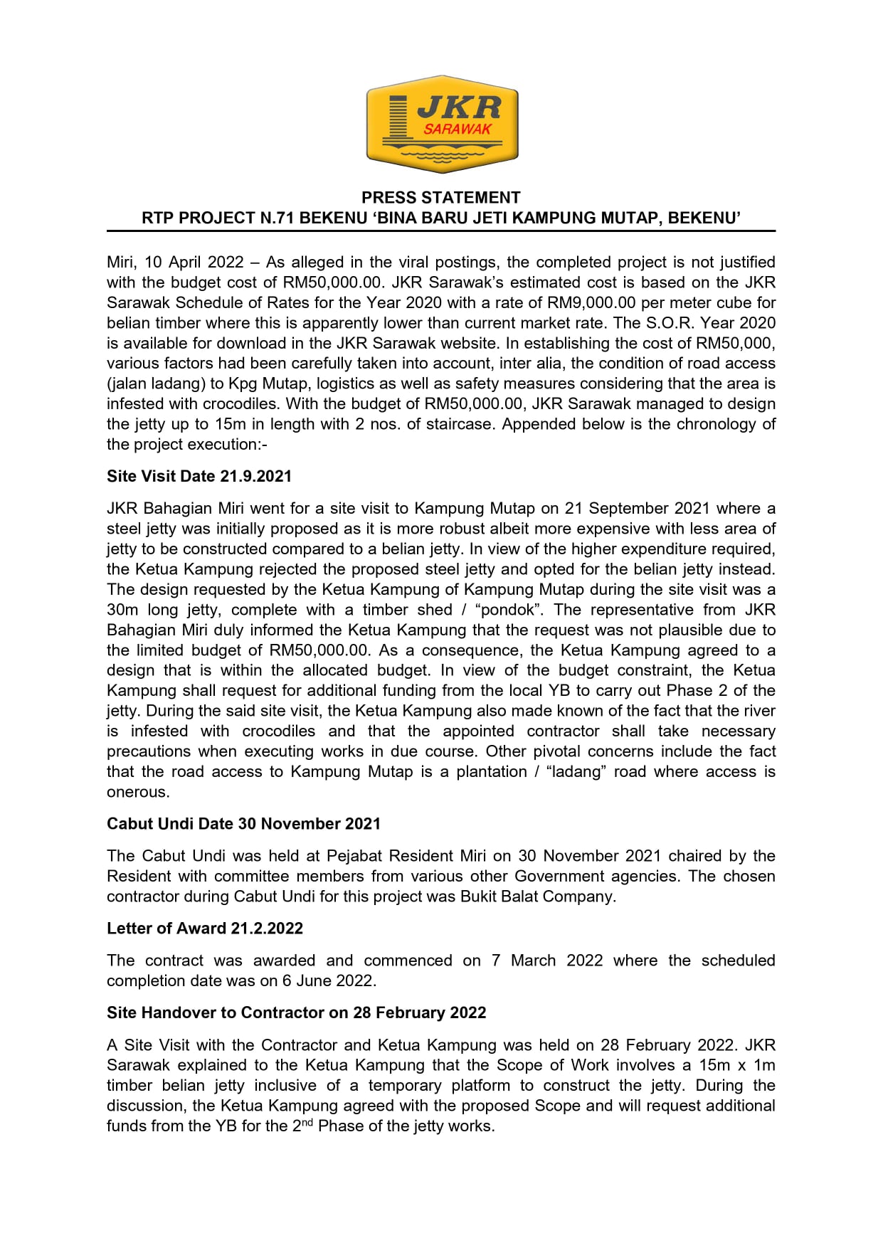 He also commented on the price but avoided conjecture as there was not enough information on final project. He did however share that the commercial price for belian wood ranged from RM4,000 to RM8,xxx per ton. In light of this, JKR Sarawak has relased a follow up statement addressing the jetty's cost price and explained that the estimated cost is based on the JKR Sarawak Schedule of Rates for the year 2020 at RM9,000 per meter cube.