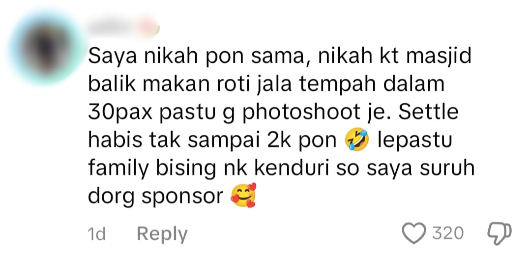 One user shared, “I did the same for my wedding. After we got married, we went home and had roti jala. We only booked for 30 pax and after that, we went for our photoshoot. We spent not more than RM2,000. But some family members keep asking for me to hold a feast so I told them to sponsor it.”