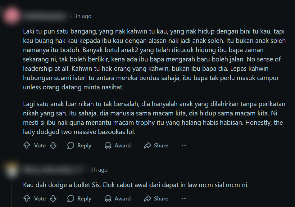"The man is also an idiot. You’re the one who wants to get married, you’re the one who’s going to live with your wife, yet you hand over your rights to your mother just so you can claim to be a 'dutiful son'. That’s not being a dutiful son — that’s just stupid," wrote a user.
