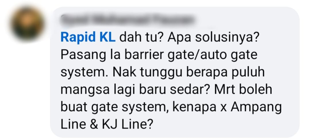 “What’s the solution then, Rapid KL? You should install a barrier gate/auto gate system. How many victims must suffer the same fate before you take action? MRT has this gate system—why hasn’t it been installed on the Ampang and Kelana Jaya LRT lines?”
