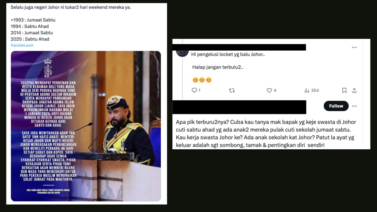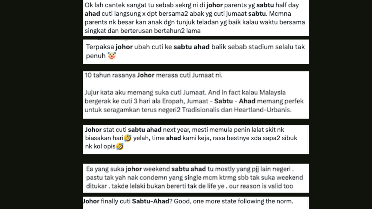 In response to one netizen saying this was a hasty decision, another said, “What is so hasty about this? Try asking parents who work in a private sector in Johor and are off on Saturdays and Sundays, but their children in school are off on Fridays and Saturdays. Are you working in a private company in Johor? Do you have children in Johor? No wonder the sentence that comes out of your mouth is arrogant and selfish.”