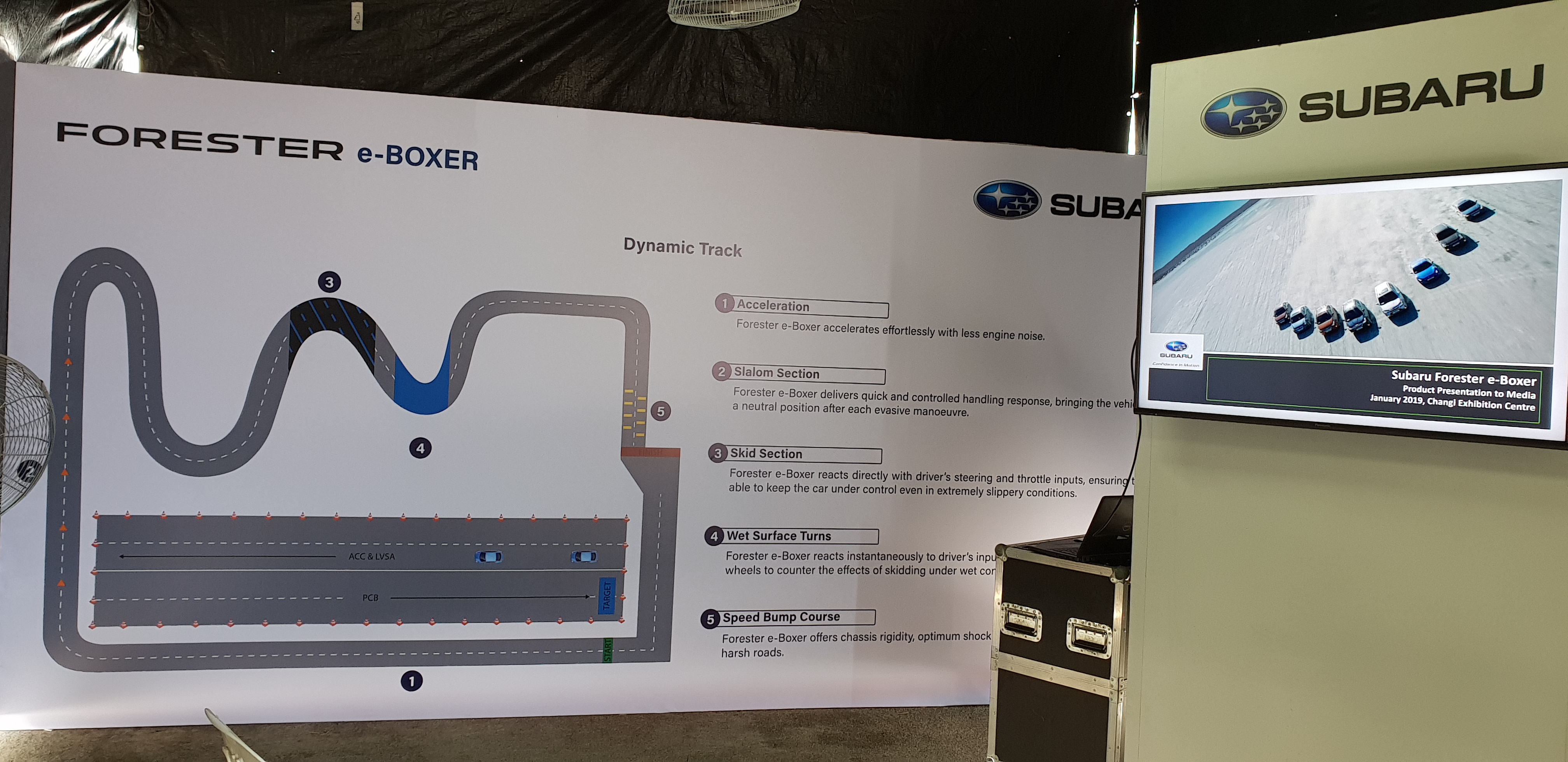 Subaru divided the course into five different section: the Acceleration straight, the Slalom section, the Skid section, the Wet Surface turns and the Speed Bump course. Each section was created to challenge the e-Boxer and test its handling, acceleration, braking and rigidity.