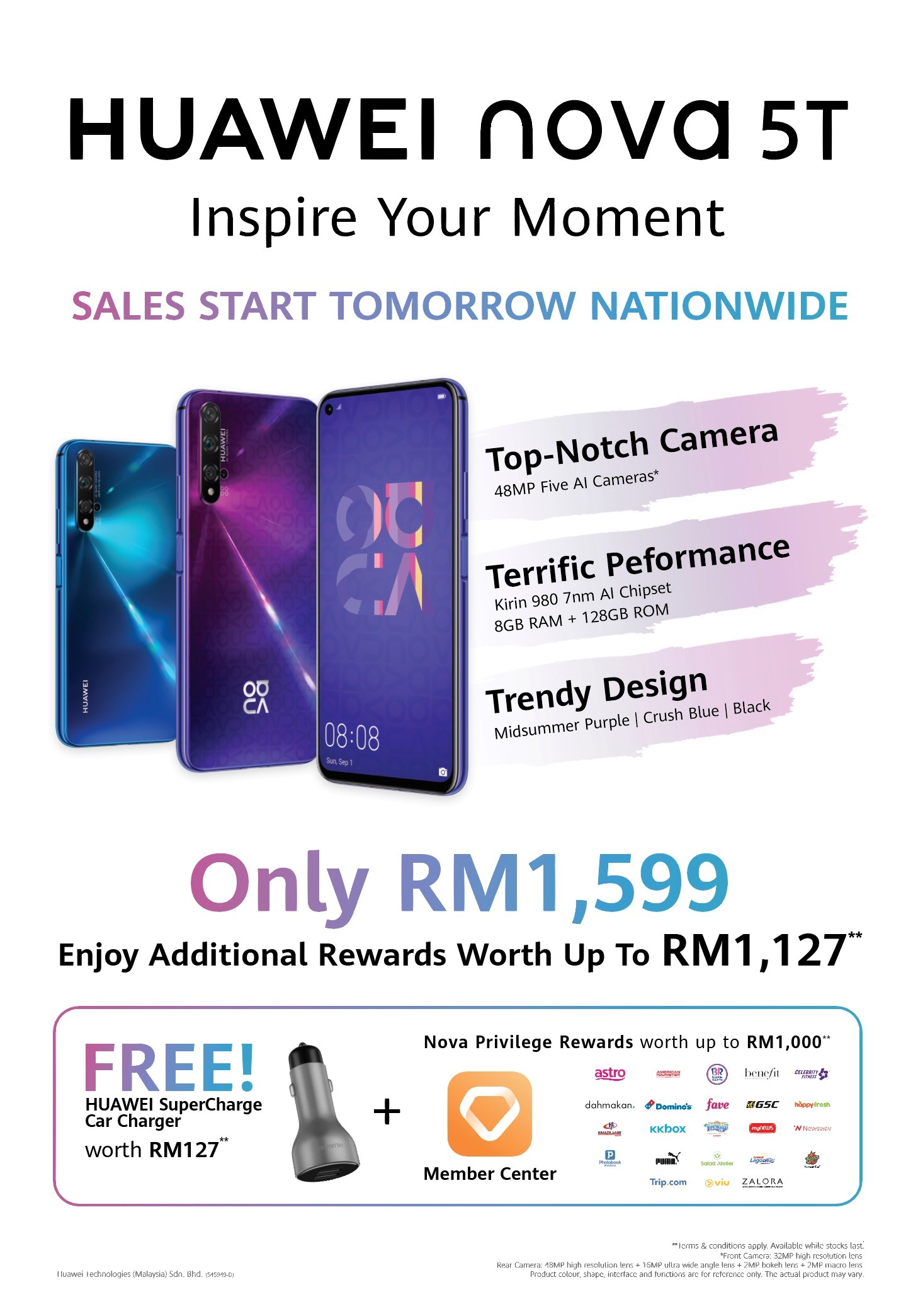 When you purchase a HUAWEI Nova 5T tomorrow, you will get exclusive free gifts which is a Huawei SuperCharge Car Charger and an additional one-year warranty, which expires on 30 September 2019.
