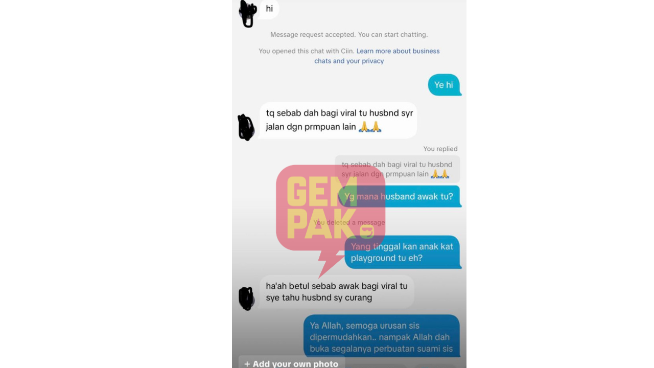“Terima kasih dah bagi viral itu suami saya jalan dengan perempuan lain. Sebab awak bagi viral itu saya tahu suami saya curang,” kata wanita itu.
